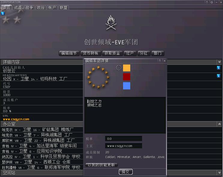 一切弄完之后就可以点"提交"了,扣除了手续费后,军团就宣告正式成立了,而你目前所在的空间站就自动成为了军团的总部。