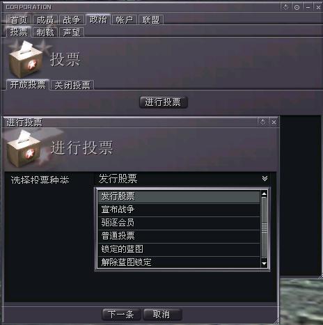 5。军团"政治"页面:这里包括有3部分,投票-------对一些日常事务的表决,制裁----可以看到敌对势力的情况,声望-----可以设置对其他军团的友好度。
