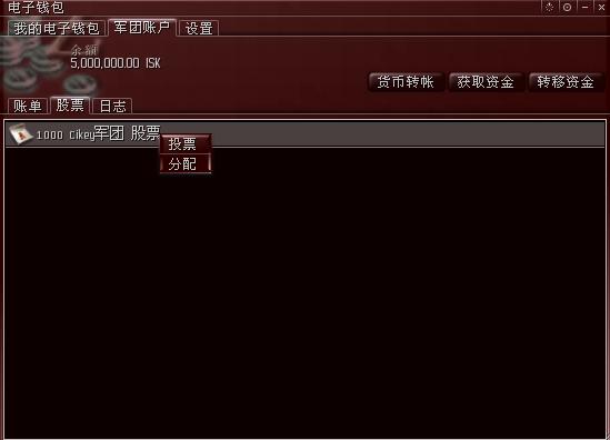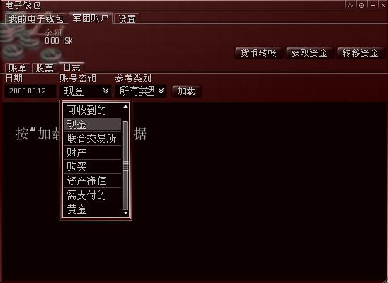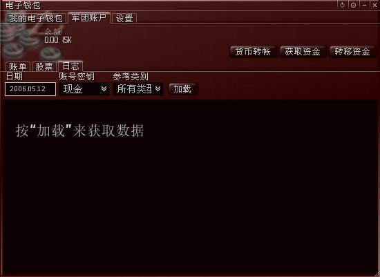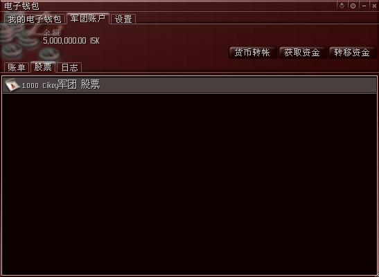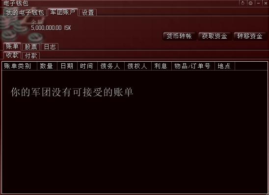 由于军团刚刚创建好,里面还没有注入资金,因此余额显示0.00 ISK。在这个窗口里,可以看到有“账单”、“股票”、“日志”三个标签,右上角有“货币转帐”、“获取资金”、“转移资金”三个按钮。下面分别说明它们的作用。