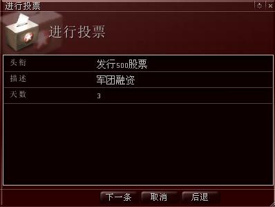 在弹出来的菜单里面选择“投票”命令。之后出现军团投票窗口,如图14所示。