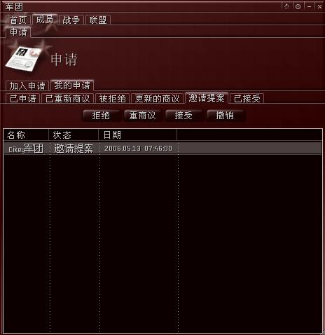 这里最常用的是“已申请”、“被拒绝”和“已接受”三个标签,“已申请”标签下列出的是你已经申请加入,但那个军团CEO还未处理的申请(图46所示)。如果申请被军团拒绝,那么它会在“被拒绝”标签下面列出,如果申请被军团接受,那么它会在“邀请提案”标签下面列出(图47所示)。