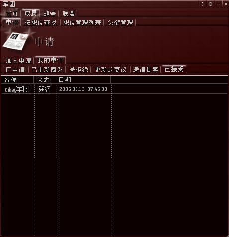 此刻你还不是军团成员,你需要点击“接受”按钮才能成为其成员。你也可以点击“拒绝”按钮来取消此次申请。你再次接受的申请会在“已接受”标签下列出(图48所示)。